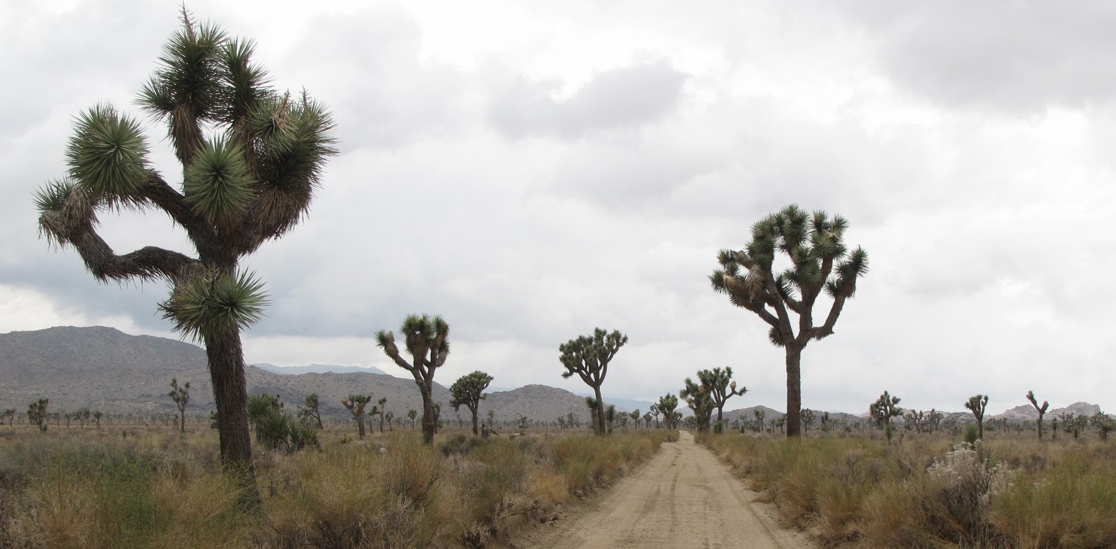 Several days ago, now, we hurriedly packed up our tent between rain showers and drove out of Joshua Tree National Park. Rained out of the desert! In a matter of moments, our tent had almost been inundated by a flash floodlet which we diverted by digging trenches in the sand with the heels of our monsoon-soaked shoes. We quickly recognized that our wonderful little tent site was in fact a wash zone, and that the whole area in which we were staying was subject to instantaneous flooding by rainwater shed from rocky outcrops all around us, so we opted to pack up and find a motel.